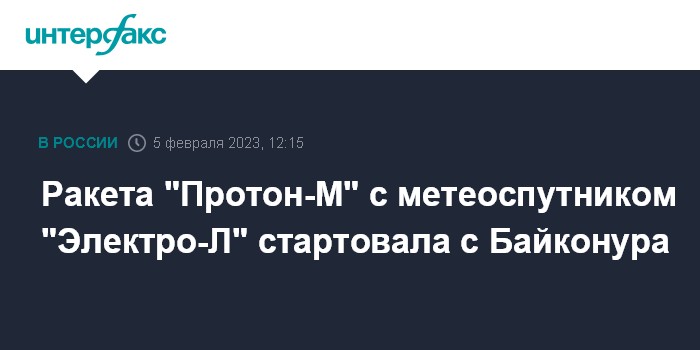 Москва. 5 февраля. INTERFAX.RU - Ракета-носитель "Протон-М" с гидрометеорологическим спутником "Электро-Л" №4 стартовала в воскресенье с космодрома Байконур, трансляцию запуска ведет "Роскосмос".