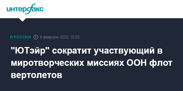 Москва. 6 февраля. INTERFAX.RU - АО "ЮТэйр - Вертолетные услуги" в связи с текущей геополитической ситуацией сокращает количество вертолетов, задействованных в рамках авиационного сопровождения миротворческих миссий ООН, сообщил президент компании Алексей Виноградов.