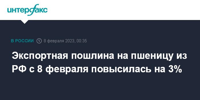 Экспортная пошлина на пшеницу из РФ с 8 февраля повысилась на 3%