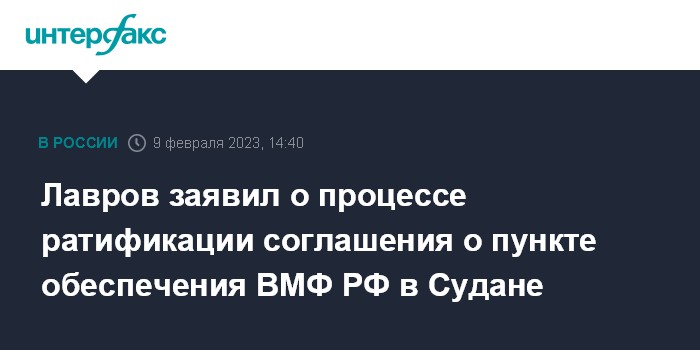 Москва. 9 февраля. INTERFAX.RU - Соглашение о пункте материально-технического обеспечения ВМФ РФ в Судане находится в процессе ратификации, сообщил в четверг глава российского МИД Сергей Лавров.