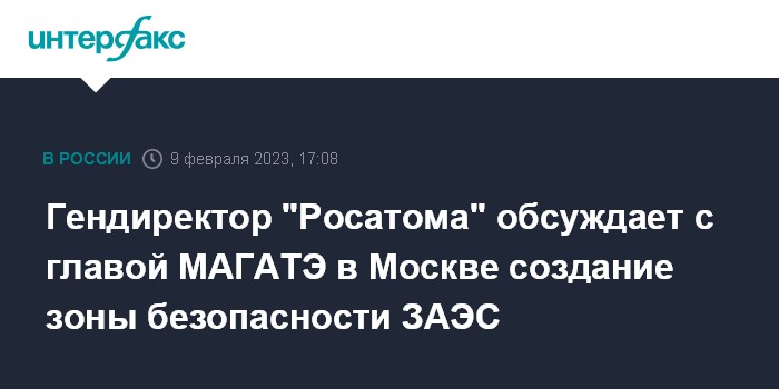Москва. 9 февраля. INTERFAX.RU - Гендиректор "Росатома" Алексей Лихачев проводит в Москве переговоры с главой МАГАТЭ Рафаэлем Гросси, в фокусе переговоров - создание зоны безопасности вокруг Запорожской АЭС, сообщила корпоративная газета госкорпорации "Страна Росатом" в своем телеграм-канале в четверг.