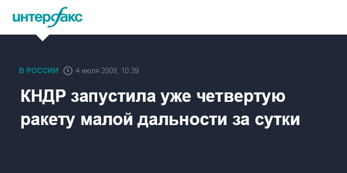 Москва. 4 июля. INTERFAX.RU - Северная Корея запустила осуществила запуск четвертой ракеты за сутки, сообщает в субботу британская телерадиокорпорация Би-Би-Си со ссылкой на южнокорейское агентство Ренхап.
