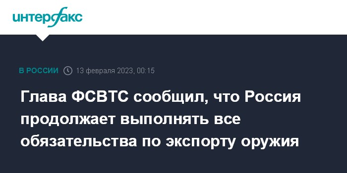 Москва. 13 февраля. INTERFAX.RU - Несмотря на западные санкции, Россия продолжает выполнять все взятые на себя обязательства в сфере экспорта вооружений, сообщил "Интерфаксу" глава Федеральной службы по военно-техническому сотрудничеству (ФСВТС) РФ Дмитрий Шугаев.