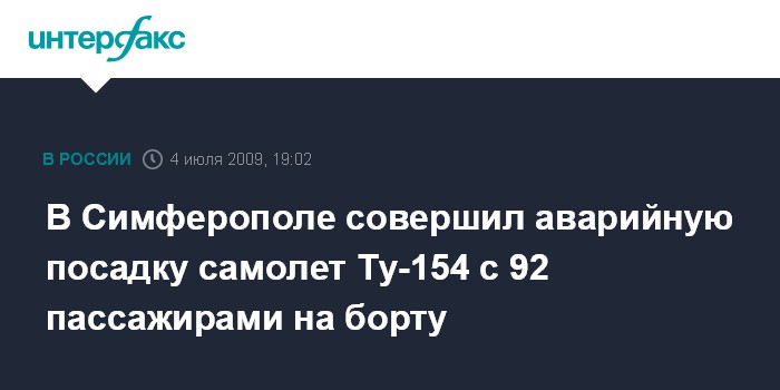 Москва. 4 июля. INTERFAX.RU - В аэропорту Симферополя около 16:00 по местному времени (17:00 мск) в субботу совершил аварийную посадку самолет Ту-154 с 92 пассажирами на борту.