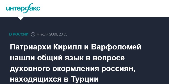 Стамбул. 4 июля. ИНТЕРФАКС - Патриарх Московский и всея Руси Кирилл положительно оценил результаты переговоров с патриархом Константинопольским Варфоломеем по вопросу пастырского попечения о россиянах, проживающих в Турции и приезжающих сюда на отдых.