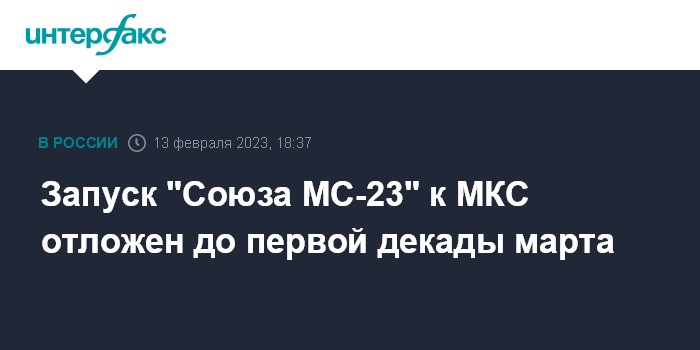 Москва. 13 февраля. INTERFAX.RU - Запуск корабля "Союз МС-23" на замену поврежденному "Союзу МС-22" к Международной космической станции (МКС) в беспилотном режиме отложен до первой декады марта для проверки системы терморегулирования, сообщил через пресс-службу глава "Роскосмоса" Юрий Борисов.