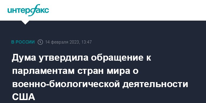 Москва. 14 февраля. INTERFAX.RU - Госдума утвердила постановление об обращении палат Федерального Собрания к парламентам стран мира в связи с военно-биологической деятельностью США.