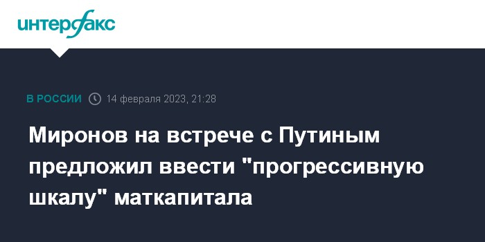 Москва. 14 февраля. INTERFAX.RU - Руководитель думской фракции "Справедливая Россия - За правду" Сергей Миронов на встрече с президентом РФ Владимиром Путиным предложил ввести прогрессивную шкалу материнского капитала и заморозить на год тарифы ЖКХ для жителей новых регионов РФ.