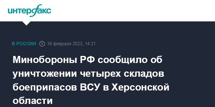 Москва. 16 февраля. INTERFAX.RU - Российские военные уничтожили четыре склада боеприпасов вооруженных сил Украины (ВСУ) в Херсонской области, заявил официальный представитель Минобороны РФ Игорь Конашенков.