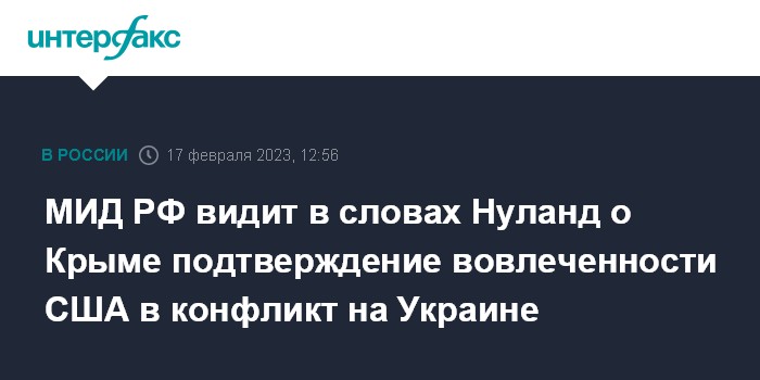 Москва. 17 февраля. INTERFAX.RU - Заявления замгоссекретаря США Виктории Нуланд о поддержке Вашингтоном нанесения ударов Украиной по российским объектам в Крыму подтверждают вовлеченность Соединенных Штатов в украинский конфликт, заявила в пятницу официальный представитель МИД РФ Мария Захарова.