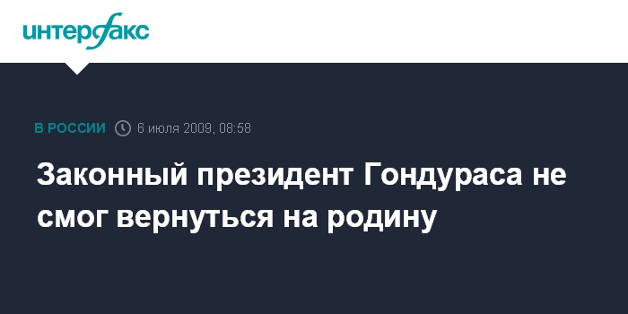 Москва. 6 июля. INTERFAX.RU - Смещенный с поста президент Гондураса Мануэль Селайя не смог возвратиться на родину. В ночь на понедельник венесуэльский самолет, в котором он находился, сделал две попытки приземления в аэропорту "Токонтин" столицы Гондураса Тегусигальпы, однако он этого сделать не смог, поскольку на взлетно-посадочной полосе была выставлена военная техника, передает американский испоноязычный телеканал "Унивисьон". В итоге самолет с Селайей был вынужден направиться в Манагуа, столицу соседнего государства Никарагуа.