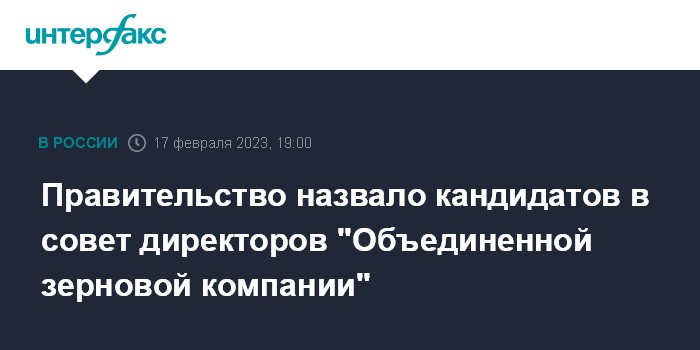 Москва. 17 февраля. INTERFAX.RU - Правительство назвало кандидатов для избрания в качестве представителей государства в совет директоров АО "Объединенная зерновая компания" (ОЗК). Список приведен в распоряжении от 16 февраля, которое опубликовано на официальном портале правовой информации.