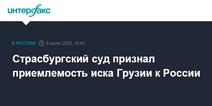 Москва. 6 июля. INTERFAX.RU - Европейский суд по правам человека в Страсбурге признал приемлемость жалобы Грузии по отношению к России. Как сообщает сайт Европейского суда по правам человека, приемлемость жалобы в дальнейшем совсем не означает обязательности удовлетворения данной жалобы.