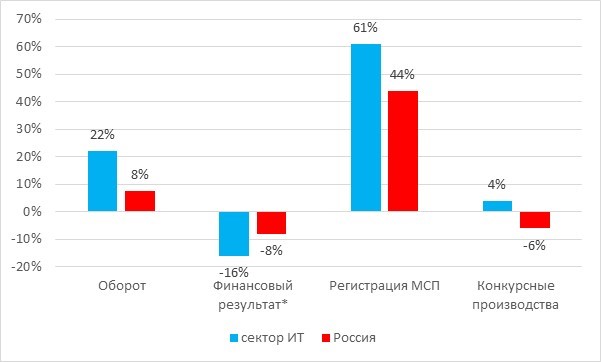 Одним из ключевых критериев, позволяющих сделать вывод о состоянии какого-либо сектора экономики является оценка сравнительной динамики его базовых индикаторов в сравнении с индикаторами экономики в целом. В прошлом году ИТ-сектор заметно превосходил национальную экономику по динамике оборота (на 14 процентных пунктов) и динамике регистрации новых малых и средних предприятий, МСП, (на 17 процентных пунктов). С другой стороны, у ИТ-сектора в 2022 г. была хуже динамика показателей "финансовый результат" ("прибыли минус убытки"), "количество конкурсных производств", "инвестиции в основной капитал". Так, за три квартала прошлого года (данные за четвертый и весь год пока еще доступны не в полном объеме) инвестиции ИТ-компаний упали на 12% на фоне их увеличения в России почти на 8%. Финансовый результат уменьшился, соответственно, на 16% и 8%. Количество конкурсных производств выросло на 4% при общем падении их числа на 6%.