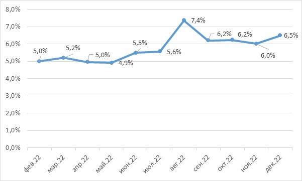 Ухудшение экономической ситуации не могло не отразиться на состоянии платежной дисциплины в ИТ-секторе. Как свидетельствуют данные "СПАРК-Интерфакс", доля компаний с Индексом платежной дисциплины (ИПД) "Высокий риск" выросла в декабре 2022 г. по сравнению с началом года на 1,5 процентных пункта до 6,5%. Однако это существенно меньше пика, достигнутого в августе.