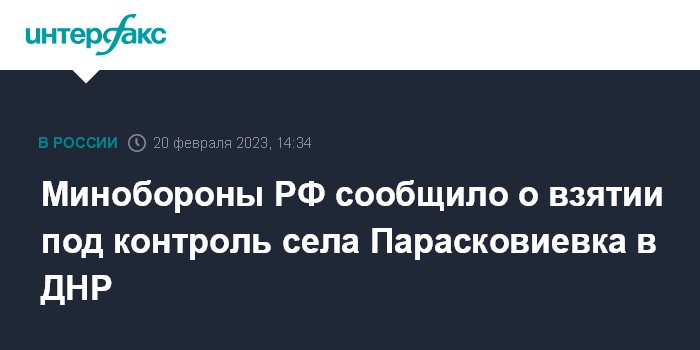 Москва. 20 февраля. INTERFAX.RU - Село Парасковиевка Донецкой народной республики (ДНР) взято под контроль российских военных, заявил официальный представитель Минобороны РФ Игорь Конашенков.