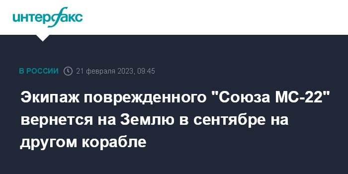 Москва. 21 февраля. INTERFAX.RU - Российско-американский экипаж поврежденного корабля "Союз МС-22" сможет вернуться на Землю на корабле "Союз МС-23" в сентябре этого года, сообщили в "Роскосмосе" во вторник.