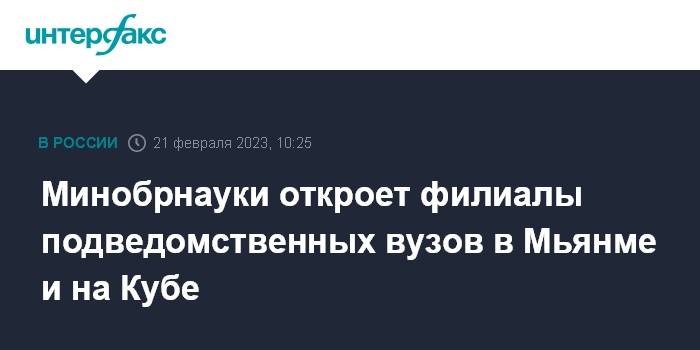 Москва. 21 февраля. INTERFAX.RU - Министерство науки и высшего образования планирует расширить сеть филиалов подведомственных вузов и открыть такие филиалы в Узбекистане, Казахстане, Египте, Саудовской Аравии, Мьянме и на Кубе, сообщила пресс-служба ведомства.