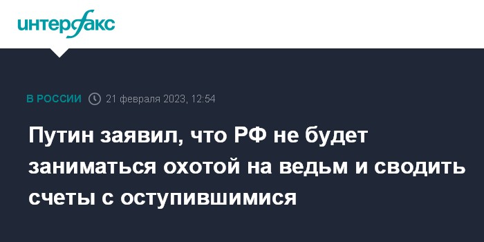 Москва. 21 февраля. INTERFAX.RU - Президент РФ Владимир Путин заявил, что Россия не будет заниматься охотой на ведьм и сводить счеты с теми, кто оступился.