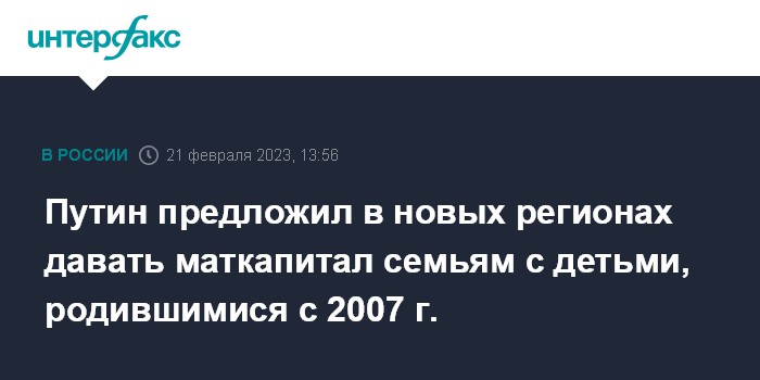 Москва. 21 февраля. INTERFAX.RU - Президент РФ Владимир Путин предложил предоставлять материнский капитал на новых территориях РФ (Донецкая и Луганская народные республики, Запорожская и Херсонская области) семьям, в которых дети родились не раньше 2007 года, заявил президент РФ Владимир Путин.