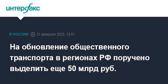 Москва. 21 февраля. INTERFAX.RU - Правительство РФ должно направить дополнительные 50 млрд рублей на финансирование инфраструктурных бюджетных кредитов для обновления парков общественного транспорта в российских регионах. Об этом заявил президент Владимир Путин, выступая с посланием Федеральному собранию во вторник.