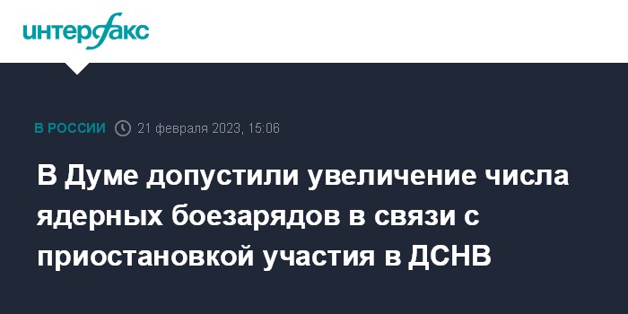Москва. 21 февраля. INTERFAX.RU - Приостановка Россией участия в Договоре о мерах по дальнейшему сокращению и ограничению стратегических наступательных вооружений означает, что в случае необходимости Россия может увеличить количество имеющихся боезарядов и носителей, считает председатель комитета Госдумы по обороне Андрей Картаполов.