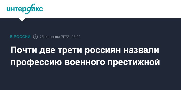 Москва. 23 февраля. INTERFAX.RU - Большинство россиян (60%) считают, что в настоящее время профессия военного в российском обществе является престижной, свидетельствуют данные опроса Фонда "Общественное мнение" (ФОМ), опубликованные на официальном сайте социологического центра.