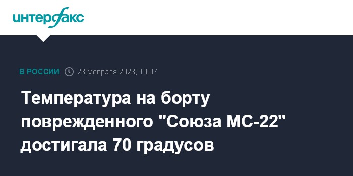 Ранее в "Роскосмосе" сообщали, что после повреждения температура в приборно-агрегатном отсеке корабля "Союз МС-22" достигала плюс 40 градусов, а в жилом - плюс 30.
