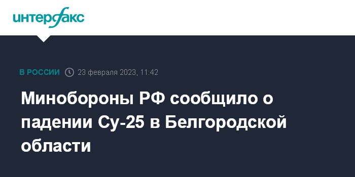 Москва. 23 февраля. INTERFAX.RU - В Белгородской области потерпел катастрофу штурмовой самолет Су-25 ВКС России, сообщили в Минобороны РФ в четверг.