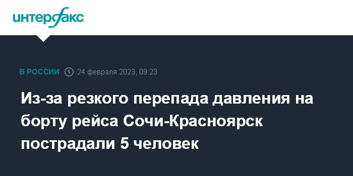 Москва. 24 февраля. INTERFAX.RU - Несколько человек пострадали из-за резкого перепада давления на борту "Боинга" во время полета из Сочи в Красноярск, сообщили "Интерфаксу" в экстренных службах.