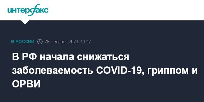 Москва. 28 февраля. INTERFAX.RU - В России началось снижение заболеваемость COVID-19, гриппом и ОРВИ; так, за неделю заболеваемость гриппом и ОРВИ снизилась на 27%, заболеваемость коронавирусом за аналогичный период уменьшилась на 11,6%, сообщили в Роспотребнадзоре.