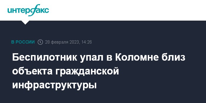 Москва. 28 февраля. INTERFAX.RU - Беспилотный летательный аппарат упал вблизи объекта гражданской инфраструктуры в подмосковной Коломне, сообщил губернатор Московской области Андрей Воробьев во вторник.