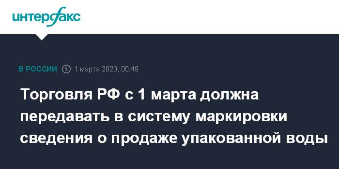 Москва. 1 марта. INTERFAX.RU - Требования об обязательной передаче в систему маркировки сведений о выводе из оборота упакованной воды при розничной продаже через кассы вступают в силу в РФ с 1 марта 2023 года.