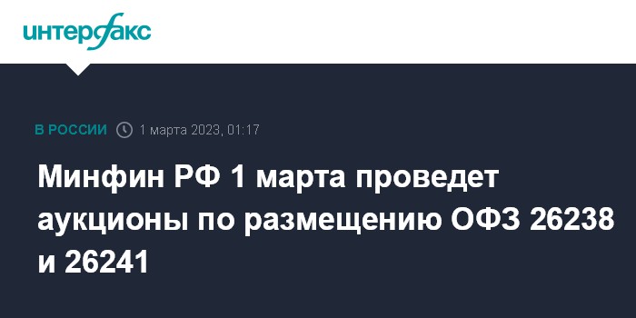 Минфин РФ 1 марта проведет аукционы по размещению ОФЗ 26238 и 26241