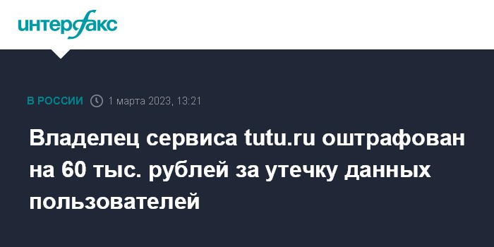 Владелец сервиса tutu.ru оштрафован на 60 тыс. рублей за утечку данных пользователей