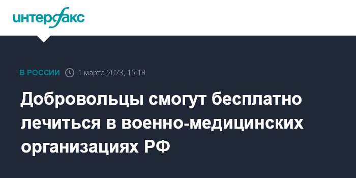 Москва. 1 марта. INTERFAX.RU - Участники добровольческих формирований смогут бесплатно лечиться в военно-медицинских частях и организациях России, а также получать лекарства и медицинские изделия, заявил премьер РФ Михаил Мишустин.