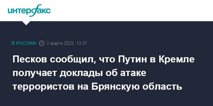 Москва. 2 марта. INTERFAX.RU - Президент РФ Владимир Путин в Кремле получает регулярные доклады от руководства силовых ведомств страны о ситуации в Брянской области, сообщил его пресс-секретарь Дмитрий Песков.