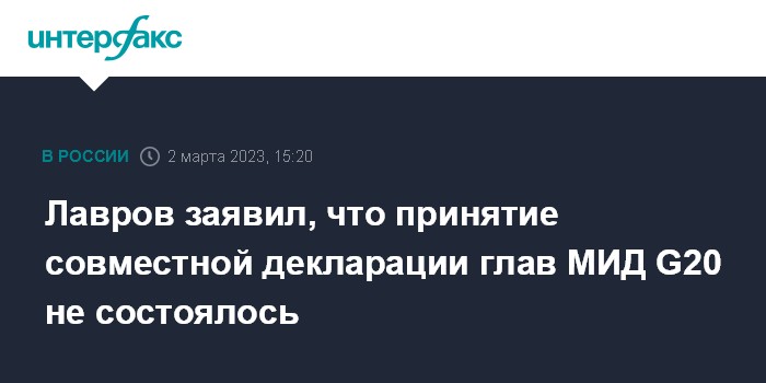 Москва. 2 марта. INTERFAX.RU - Министры иностранных дел стран "Большой двадцатки" не смогли согласовать общую декларацию по итогам двухдневной встречи в Нью-Дели, вместо нее будет обнародовано резюме от имени председательствующей Индии, сообщил на пресс-конференции глава МИД России Сергей Лавров.