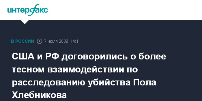 Москва. 7 июля. INTERFAX.RU - Генеральная прокуратура России и министерство юстиции США договорились о взаимодействии в расследовании убийства главного редактора русской версии журнала "Форбс" Пола Хлебникова.
