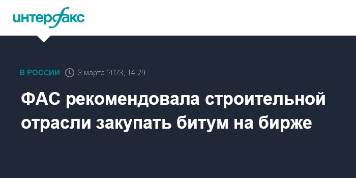 Москва. 3 марта. INTERFAX.RU - Федеральная антимонопольная служба рекомендует участникам рынка строительной сферы закупать битум на бирже. Все необходимые организационно-технические условия для этого созданы, говорится в пресс-релизе ведомства.