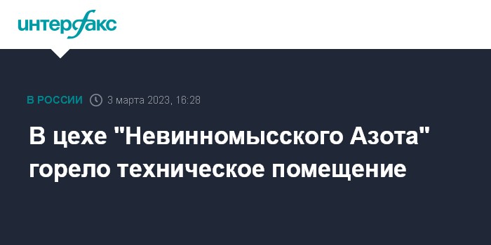 Москва. 3 марта. INTERFAX.RU - В цехе химического завода АО "Невинномысский Азот" 3 марта случился пожар в кладовке, его быстро потушили, никто не пострадал.