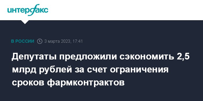 Москва. 3 марта. INTERFAX.RU - Депутаты Госдумы предлагают сэкономить для бюджета от 2,5 млрд рублей в год за счет ограничения сроков действия контрактов на закупку лекарств в соответствии со сроками окончания правовой охраны патента на то или иное лекарство.
