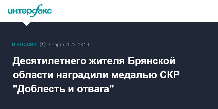 Москва. 3 марта. INTERFAX.RU - Десятилетнего Федора по поручению председателя СКР Александра Бастрыкина наградили ведомственной медалью "Доблесть и отвага" за его действия во время происшествия в Климовском районе Брянской области.