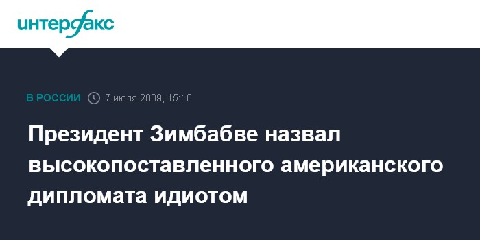 Москва. 7 июля. INTERFAX.RU - Президент Зимбабве Роберт Мугабе назвал заместителя госсекретаря США по делам Африки Джонни Карсона идиотом с высокомерным отношением к его стране, сообщает британская телерадиокорпорация BBC. "Вы не стали бы разговаривать с идиотом от природы. Я очень разозлился на него. Он думает, что может диктовать нам, что делать и чего не делать", - сказал Мугабе после беседы с высокопоставленным американским дипломатом, прошедшей в рамках саммита Африканского союза в Ливии на минувшей неделе.