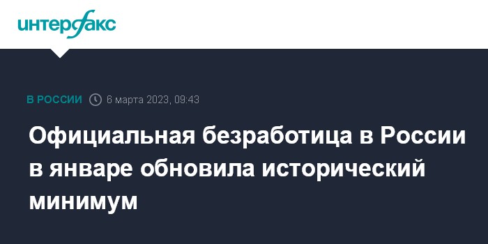 Москва. 6 марта. INTERFAX.RU - В январе уровень безработицы в России, рассчитанный по методологии Международной организации труда, обновил исторический минимум и составил 3,6%, сообщила вице-премьер Татьяна Голикова после заседания межведомственной рабочей группы по восстановлению рынка труда. Об этом сообщает аппарат вице-премьера.