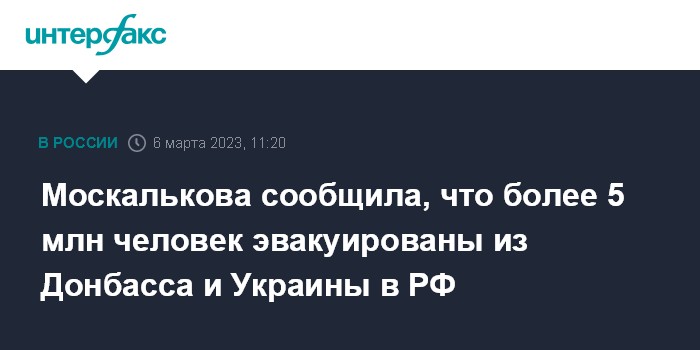 Москва. 6 марта. INTERFAX.RU - Более 5 млн экстренно эвакуированных граждан прибыли в Россию из Донецкой и Луганской народных республик и Украины, сообщила уполномоченный по правам человека в РФ Татьяна Москалькова.