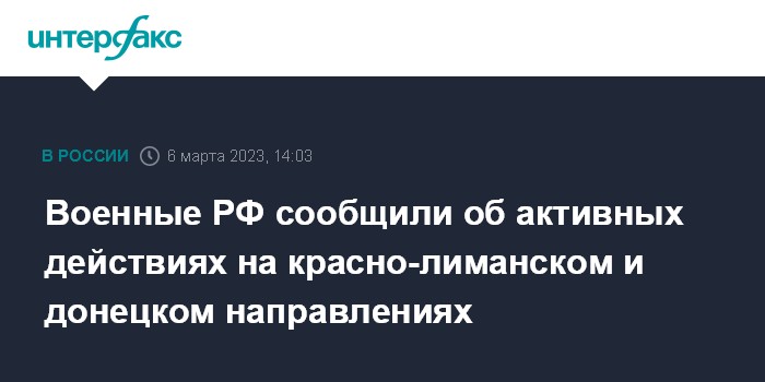 Москва. 6 марта. INTERFAX.RU - Российские группировки войск "Центр" и "Южная" ведут активные действия на красно-лиманском и донецком направлениях, сообщил официальный представитель министерства обороны РФ генерал-лейтенант Игорь Конашенков.