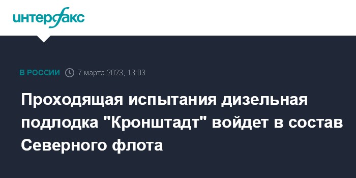Москва. 7 марта. INTERFAX.RU - Министр обороны РФ Сергей Шойгу сообщил, что проходящая испытания дизель-электрическая подводная лодка "Кронштадт" проекта 677 "Лада" войдет в состав Северного флота, она будет оснащена крылатыми ракетами "Калибр".