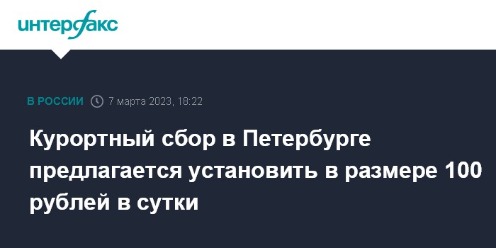 Москва. 7 марта. INTERFAX.RU - Размер курортного сбора в Петербурге может составить максимально допустимые федеральным законодательством 100 рублей, следует из документа, опубликованного на сайте городской администрации во вторник.