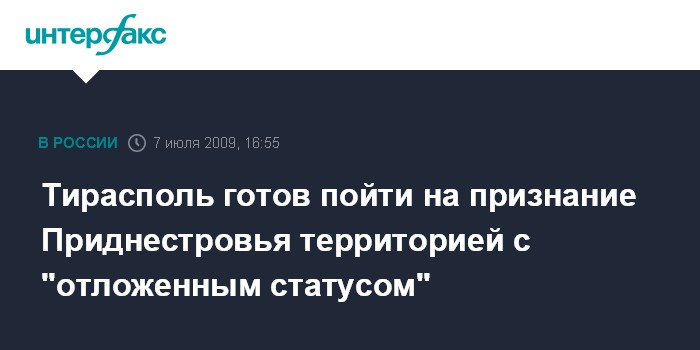 Москва. 7 июля. INTERFAX.RU - Приднестровье согласилось бы на "отложенный статус" признания республики, заявил во вторник глава приднестровского МИД Владимир Ястребчак в ходе встречи с депутатом Бундестага Райдером Штеенблоком и заместителем посла Германии в Молдавии Юлией Круменнауе.